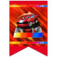 Kids Race Car Party Bunting with a comic race car on a red background, a chequered flag, race car with a blue background and a chequered flag.