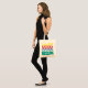 Kids Rainbow Chevron Colourful Pretty Girls Personalised Tote Bag. Choose from a variety of styles and sizes. Fun and brightly coloured rainbow tote bag with yellow, orange, red, purple, blue and green chevron stripes. Name is personalised in pretty white font with green background. Fun tween, teen or kids gift ideas in rainbow theme.