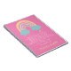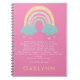 A delightful notebook for a little girl, featuring the popular Bible verse Philippians 4:8 in white, and pastel illustration of rainbow with clouds and hearts, in mustard yellow, teal and lilac, on a pink background. Personalise with child's name in mustard yellow.