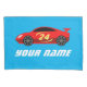 Kid's red racecar pillowcase with custom name. Personalized pillowcases for girl's or boy's room. Cute pillow case with racing car logo for children's bedroom . Trendy home decor for son or grandson. Blue or custom background color. Lettering can be spaced out. Fun Birthday gift ideas.
