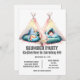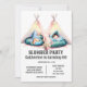 A beautiful watercolor ai graphic featuring two realistic 3D looking glamping style teepee tents in pink and white that have medium blue round mattresses inside them on top of which a little boy and a little girl are sleeping inside their own sleeping bags. A box of popcorn rests on the floor between the two tents and the illustration is set against a white background that has editable black text templates on it for your custom wording. These are ideal for your son or daughter if they are having a sleepover / slumber / popcorn and pajama party for friends to celebrate their birthday.