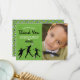 Soccer themed birthday thank you cards featuring a green football pitch background, a photo of the child, soccer players, footballs, and a modern thank you template that is easy to personalise.