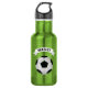 Soccer themed water bottle featuring a lush green background, a football pitch, a soccer ball, and a personalised name template in a white banner.