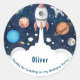 Kids Space Theam thanks Classic Round Sticker This birthday party favour sticker featuring watercolor illustration of space with planets, rocket , stars and Astronaut in space suit with blue background text says "Thanks for landing on my Birthday party!. "All text are fully personalise with edit tool.