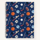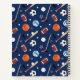 This fun kids sports equipment pattern has soccer balls, footballs, baseballs, volleyballs, hockey sticks and pucks, and baseball bats. The athletic gear has a background of dark blue. It makes a great addition to the school supplies of a little boy or girl. It also makes a cute back-to-school, birthday, Christmas, or other holiday gift.