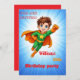 Invite friends to your little hero’s birthday with this vibrant superhero card! Features a flying cartoon hero on a bright blue background. Fully customizable for boys and girls. Perfect for superhero-themed parties.