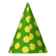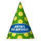 Kid's tennis ball sports theme Happy Birthday party hats. Funny paper cone hats with yellow tennis ball and custom text. Sports themed party supplies and celebration accessories for children or adults. Create a fun surprise party for player, coach, mum, dad, girl, boy, friend, team, trainer etc. Customisable colours and text template.