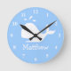 Kids wall clock with cute whale cartoon and personalizable name. Cute gift idea for boy's baby room. Light blue nursery decoration.