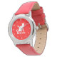 Kids watch with white cat | Customisable with pet name. Personalizable wrist watches for children. Cute Birthday gift idea for girls. Silhouette of white kitten design. Red background.