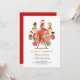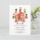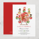A kid's Christmas Birthday invitation. The festive holiday design features a red and green winter wonderland Ferris wheel, with children in Christmas fancy dress as santa, an elf, reindeer, penguin and more.