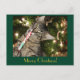 This Christmas postcard features our young Siberian cat, Kimber, as he holds a candy cane in his big paws and tries his best to rip through the plastic wrapper and eat it. He is seen with a festive Christmas tree behind him. Kimber had stolen this candy cane off of our Christmas tree and was determined to eat it. This funny postcard is perfect for everyone.