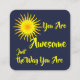 Raise self esteem with Kindness Cards! These are square business card sized cards with positive and inspirational words to hand out to friends, hide in family member's lunches, or leave for a stranger to find to brighten up their day. This design includes a bright yellow orange sun and the text "You Are Awesome Just the Way You Are".