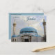 This postcard features the King Abdullah Mosque in Amman Jordan. The King Abdullah I Mosque in Amman, Jordan was built between 1982 and 1989. It is capped by a magnificent blue mosaic dome beneath which 3,000 Muslims may offer prayer. Photo credit: David Stanely, 2017.