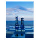 Photograph of a glass king and queen chess pieces taken against a seascape.
