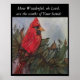 Vibrant red "King Cardinal" proudly sits on a branch with leaves. This poster is captioned with a reminder of the gifts this world has to offer, "How Wonderful, Oh Lord, are the works of Your Hands" Ready for framing.