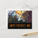 King Lion and Lion Cubs artistic Father's Day postcard features a male lion watching over his three lion cubs hiding in the grass with a colourful stained glass sky behind digitally painted by our talented children’s book illustrator, Traci Van Wagoner. With the words Happy Father's Day below on black, this lion family is a perfect to send your dad, father, pa, papa your greetings on his special day. Make your father King for the day with this king of the jungle art postcard.