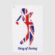 NewParkLane - Golf Towel, with a golf player in silhouette coloured with a British Flag - the Union Jack, and fun quote 'King of Swing'.