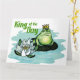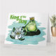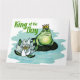 A frog king with a crown sitting on a leaf next to a white Waterlily.