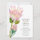 Elegant floral wedding invitation featuring pink based colourful and exotic king protea (also known as sugarbushes). There is also a stylish gold ampersand between the bride and groom's name. The rest of the texts are simple and subtle. The flowers were hand painted with watercolor. Original artwork and design by Namibear Art Studio. ©namibear