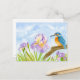 This postcard features a vibrant kingfisher perched on a branch, surrounded by softly blowing purple and white irises. Painted in a loose watercolor style, the scene captures a gentle breeze moving through the blooms, creating a peaceful moment in nature.