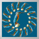 An enchanting depiction of a circle of beautiful Kingfisher birds, with glorious orange, blue and white plumage, set against a deep blue background.