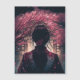Computer-generated design of a Geisha in a cherry blossom spell. A picture of a woman wearing a kimono, with a nice hairstyle and flowers in her hair. Japanese design in AI - Midjourney Style. Dark background with bubbles reminding of fire. In the background is a building that exudes a bright light, giving you a familiar and melancholic atmosphere.