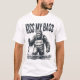 This white t-shirt features the text "KISS MY BASS" in a bold, off-white font above a vintage-style illustration of Bigfoot standing in water, holding a fishing rod with a caught fish. The design is humourous and combines the mythical creature with a fishing theme.