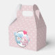 Favour boxes with a cute cartoon image of a bear couple, the she bear is pastel pink with a little bow and she is kissing the cheek of a blue bear who looks positively delighted. A little pink heart is floating above their heads. Very cute and kawaii. Background pattern is a muted pink colour with white polka dots.