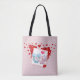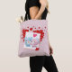 Shoulder bag with a cute cartoon image of a bear pair, one bear is pastel pink with a little bow and she is kissing the cheek of a blue bear who looks positively delighted. Very cute and kawaii. Lots of red hearts floating all around. Muted Pink background with a white polka dot pattern
