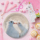 Image of two white kissing doves against the beige stylish background. Dark text Love is in the air. Customisable. You can change or delete the text. Funny, romantic, elegant and perfectly one of a kind paper plates for any party or reception.