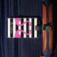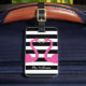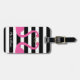 This tropical luggage tag is decorated with a fuchsia kissing flamingos on a black and white striped background and personalised with Mrs. new last name, on the front, and all your personal information on the back, making it perfect for her honeymoon.