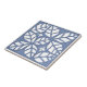 Thisdecorative ceramic tile features a stylised ovate leaf design. The colours are blue and white.