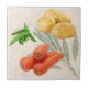 Brighten your kitchen with these charming ceramic tiles decorated with images of freshly grown vegetables. Gues Who has created nine patterns, each with a different set of home grown garden vegetables. Each style has an herb/beige background. The 4.25 x 4.25 size makes these tiles perfect to use as a stove-side holder for a ladle, baster or spoon as you are preparing your family's meal. Choose all nine tiles and use them as a colourful border for your kitchen back-splash or, choose a few and use them as a collage to brighten your kitchen wall.