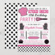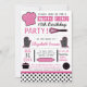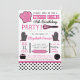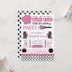 Modern kitchen cooking themed birthday party invitations feature typography, kitchen accessories and utensils, and polka dot patterns in a black, pink, and white colour scheme.