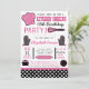 Modern kitchen cooking themed birthday party invitations feature typography, kitchen accessories and utensils, and polka dot patterns in a black, pink, and white colour scheme.