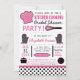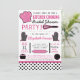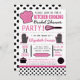 Modern kitchen cooking themed bridal shower party invitations feature typography, kitchen accessories and utensils, and polka dot patterns in a black, pink, and white colour scheme.