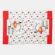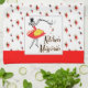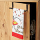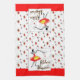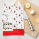 A retro cooking towel with custom script letters and reading "Kitchen Magician" while a magical chef girl cooks up a little magic in the kitchen with sparkly retro letters in black, red and yellow with red borders and a black and red retro star pattern.