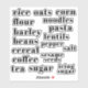 Currently features rice, oats, corn, flour, noodles, pasta, barley, lentils, beans, pepper, salt, cereal, sesame seeds, coffee, tea, sugar, icing sugar.