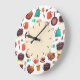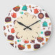Very cute retro style home cooking pots and pans, pitcher, coffee pot, fruit bowl and utensils on a kitchen clock with dull pink scalloped lace with hour notches in brown.