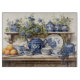 Pretty vintage look watercolor image of a wooden, country shelf with elegant blue and white porcelain dishes, teapot, sugar & creamer. Some containers hold pretty blue flowers. There are assorted containers, dishes and bright oranges on the shelf.