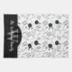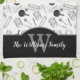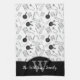 Our original kitchen utensils and accessories pattern in black on a white background with bottom black banner border with your family's initial and name. Original design by Holiday Hearts Designs (all rights reserved).