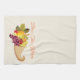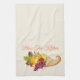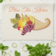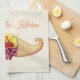 Kitchen towel shown in a off white colour with a art print of a Thanksgiving cornucopia. Text of "Bless This Kitchen" above cornucopia.
