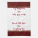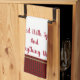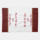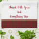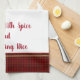 This kitchen towel is shown in petite red plaid with tan accent stripes. Words of "Blessed with spice and everything nice". Shown on a white towel.
