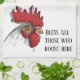 "Bless all those who roost here" is the caption on this kitchen towel featuring a white chicken head. Customise this item or buy as shown.