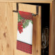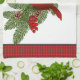Holiday kitchen towel shown in white with a festive Christmas red plaid print and a cardinal bird design.