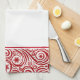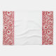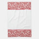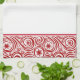 Holiday kitchen towel shown in white with a festive Christmas red snowflakes swirl design.