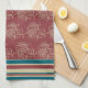 An elegant cotton Kitchen Towel or Tea Towel, with a formalised floral pattern and deckchair stripes in beige and dark blue on a rich burgundy background.