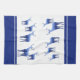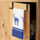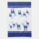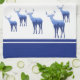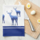 This kitchen towel is shown in wintery blue and white colours with white accent stripes over royal blue. Several deer in blue tones with wintery scenes shadowing on their bodies grace both ends of this towel. Over white background.