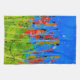 Kitchen towel with splashed-colours: abstract design (turquoise, green and touches of red). And "Happy Cooking!" is printed on the towel!