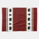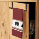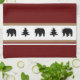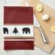 This kitchen towel is shown in a cute lodge style print of bears and fir tree icons in black silhouettes over white stripes and burgundy and tan colour stripes towel with white accent stripes on each end.